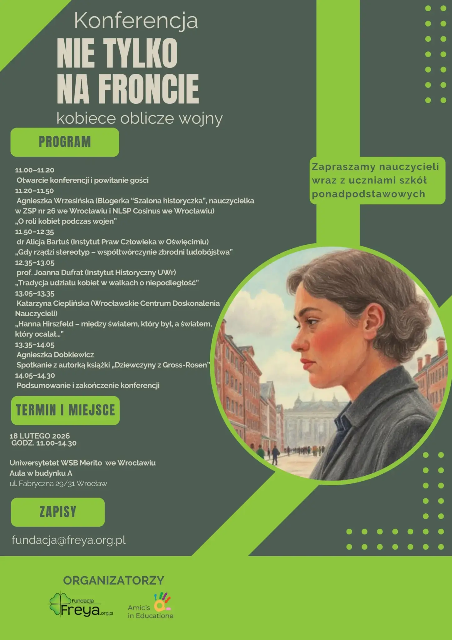 Konferencja „Nie tylko na froncie – kobiece oblicze wojny” skierowana jest do uczniów szkół ponadpodstawowych i poświęcona problematyce roli oraz doświadczeń kobiet w realiach konfliktów zbrojnych. Jej celem jest ukazanie wielowymiarowego udziału kobiet w czasie wojny – zarówno w działaniach zbrojnych i konspiracyjnych, jak i w codziennej walce o przetrwanie, ochronę rodziny oraz zachowanie wartości humanitarnych.